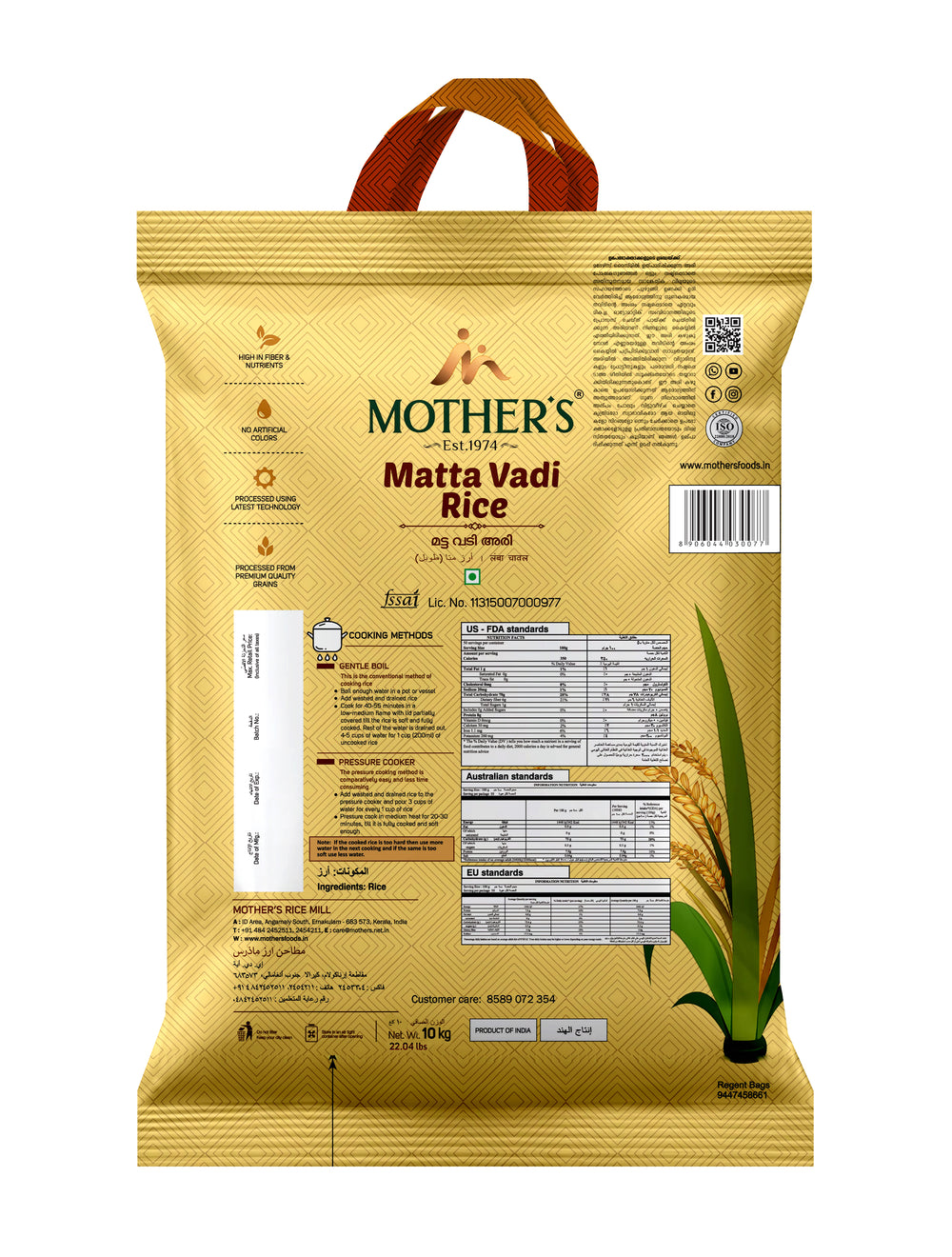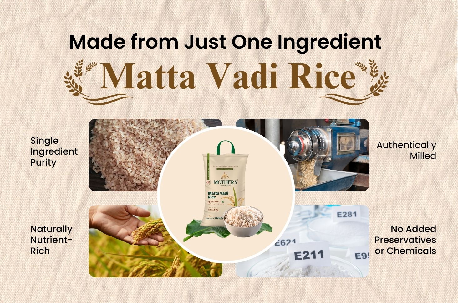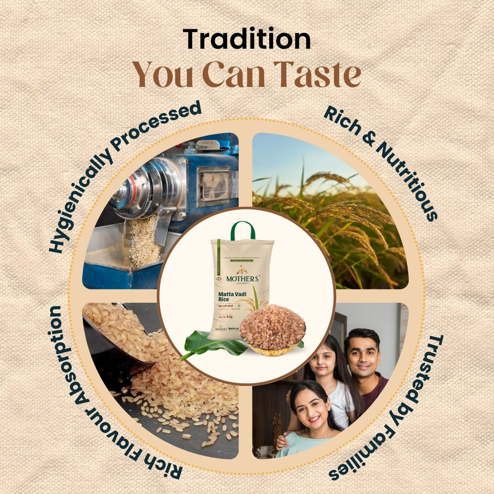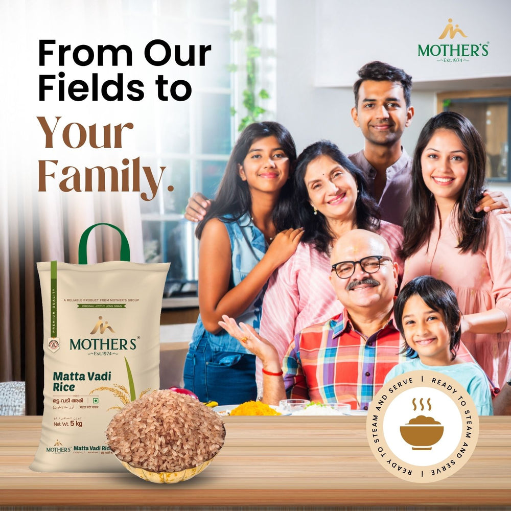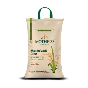 Mother’s Matta Vadi Rice is available in 5 kg and 10 kg variants, it suits both small households and bulk buyers. For those comparing Matta Vadi Rice and Brown Rice, this variant stands out for its taste, texture, and nutritional value. Whether you are looking for Matta Vadi Rice price ranges, or its availability online, this pack meets the expectations of families seeking dependable Kerala everyday meals.